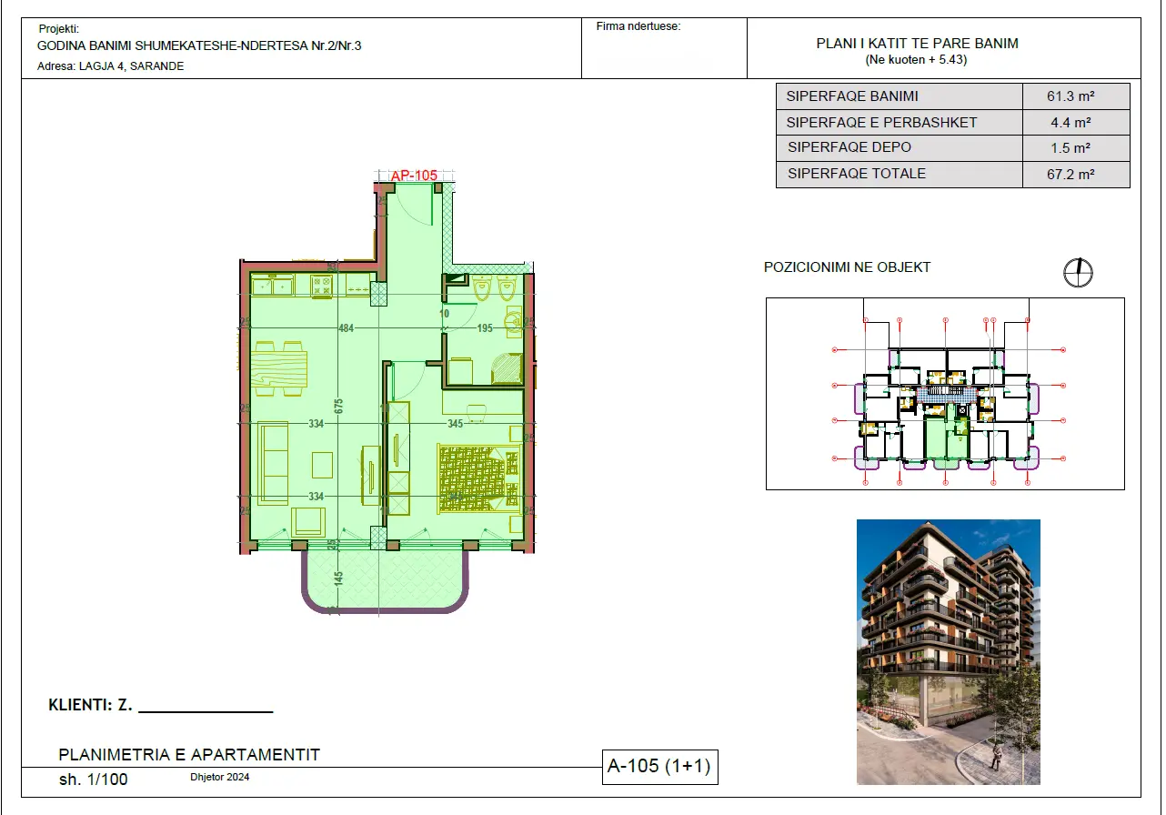 - Ndërtim Modern dhe Cilësi: Godina është projektuar me standarde të larta bashkëkohore, duke siguruar qëndrueshmëri, efikasitet energjetik dhe një estetikë tërheqëse. Fasada dhe ambientet e përbashkëta janë menduar për të ofruar një përvojë luksoze jetese.