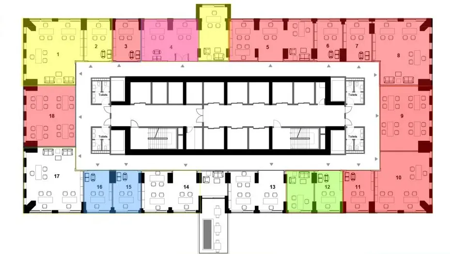 • Hapësira Funksionale: Zyrat ofrojnë mjedis kompakt dhe praktik për punë. Kati përfshin tualete të përbashkëta të mirëmbajtura (siç tregohet në planin e katit), duke maksimizuar hapësirën tuaj private.